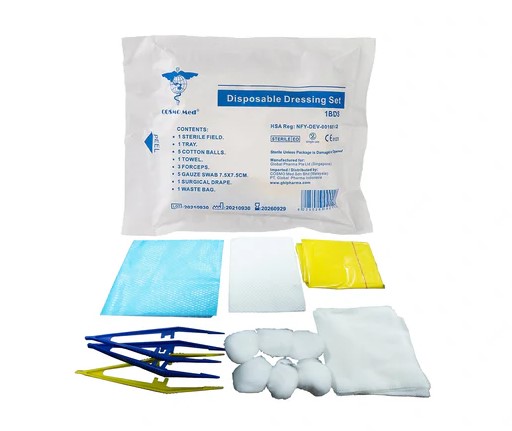 Includes a dressing tray, gauze, cotton balls, disposable plastic forceps, and a dressing towel.